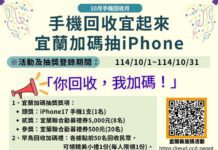 宜蘭縣政府環境保護局配合環保理「十月手機回收月活動」,加碼「廢手機回收宜起來,宜蘭加碼抽i鳳」活動,獎項包含iPhone 13 mini 128G及200元7-11禮券,宜蘭縣民只要在活動期間將舊手機拿到指定地點回收,每回收1支手機即可兌換1張抽獎序號單,同1組序號及認證碼需分別登錄環保署活動網站(https://phonerec.tw/)與環保局加碼活動表單(https://forms.gle/qTbA5t48JA6WM5jYA),即可獲得雙重抽獎資格!