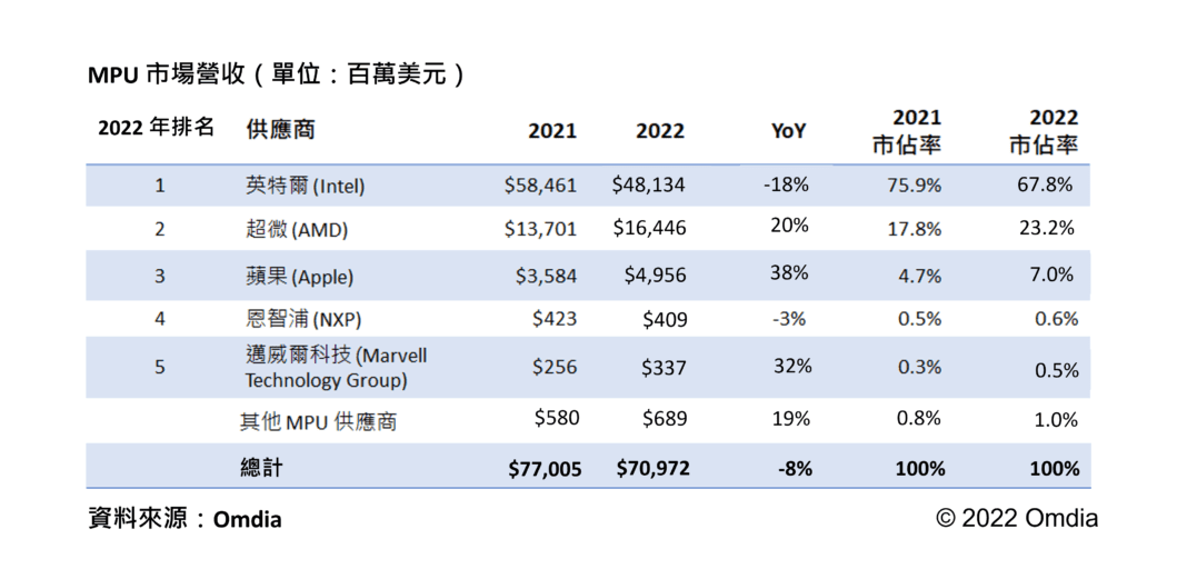 Omdia 預測 2022 年全球 MPU 市場下滑 PC 需求放緩衝擊 Intel ,AMD、Apple 藉電競市場與自研晶片急起直追