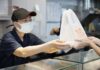 ▲科林助聽器協理陳俊旭(左)向新北市副秘書長龔雅雯(右)說明造型係根據兒童的耳蝸利用3D列印設計製作 非常的精巧。(圖/新北市社會局提供)