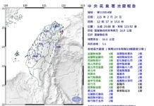 今(11)天晚間發生有感地震,根據中央氣象局地震報告顯示,晚間8點25分發生芮氏規模5.2地震,震央在花蓮縣政府東北東方92.9公里 ,位於臺灣東部海域,地震深度達44.4公里,各地震度級如下: