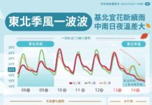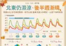周二(8/1)起,受颱風外圍環流影響,迎風面的北部為有短暫陣雨,南部則在風場繞流影響下,偶有零星降雨,其他各地多雲為主,午後山區有零星短暫陣雨,各地高溫約31~34度,花東地區得留意局部焚風。到了周三(8/2),颱風仍近、西南風漸增,北臺灣的天氣須視颱風距離遠近而定,中南部則因西南風有局部、短暫降雨。