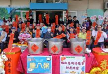 ▲佛光山月光寺致贈臘八粥,副縣長顏新章(左七)等人滿心感激。(圖/縣政府提供)
