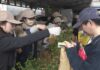▲東光國中家長會鄭宇竣(左起)、縣議員陳鴻禧及村却董事長蔡建庭與作品及學生合影。(圖∕東光國中提供)