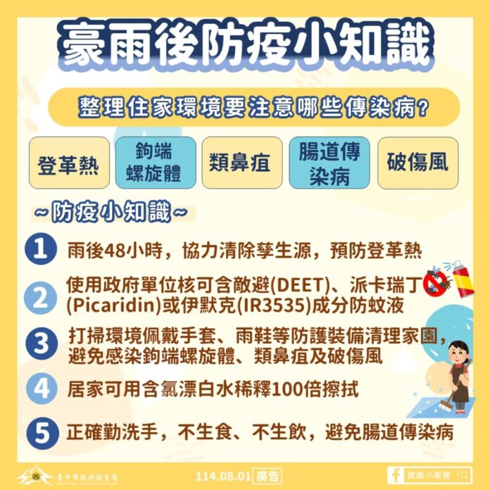 近日因氣候影響,國內中南部多有大雨或豪雨,台中市也發生豪雨等級以上降雨,並有部分地區短時間淹水,豪大雨後可能有傳染病傳播的風險。市府衛生局提醒,市民朋友豪雨後防疫注意事項,協力預防傳染病,以維護自身及家人健康。