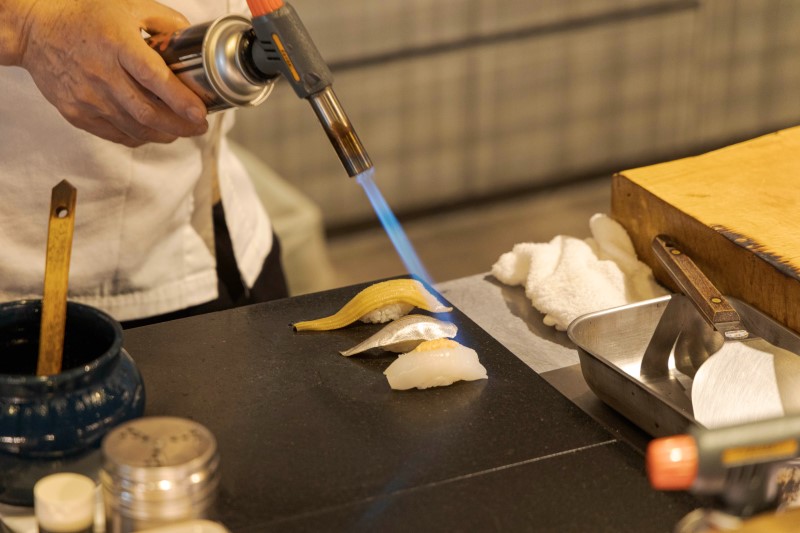 如果你偏好一次品嚐多種魚種風味,那麼這份鮮魚握壽司絕對不容錯過。包含花枝握壽司(搭配明太子醬)、炙燒小鯽魚、炙燒星鰻、魚子醬鮪魚、鮭魚佐鮭魚卵、大海老等,每一貫都可選擇生食或炙燒。而搭配上則由師傅依當日市場新鮮魚種隨機組合,確保每次來訪都能有驚喜與新意。