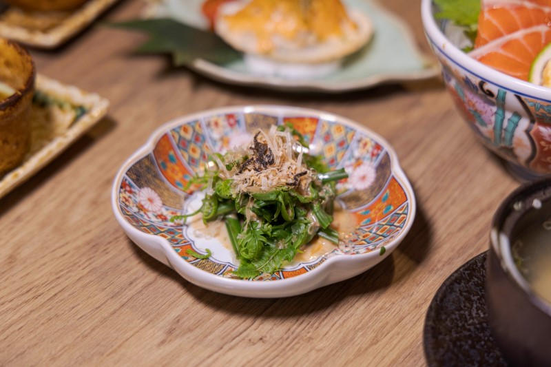 ▲先付|旬手作小品。使用過貓時蔬、北海道鹽昆布、鮪魚絲與特調胡麻醬,滑順清爽中帶有層次堆疊,是整個套餐的開場序曲。
