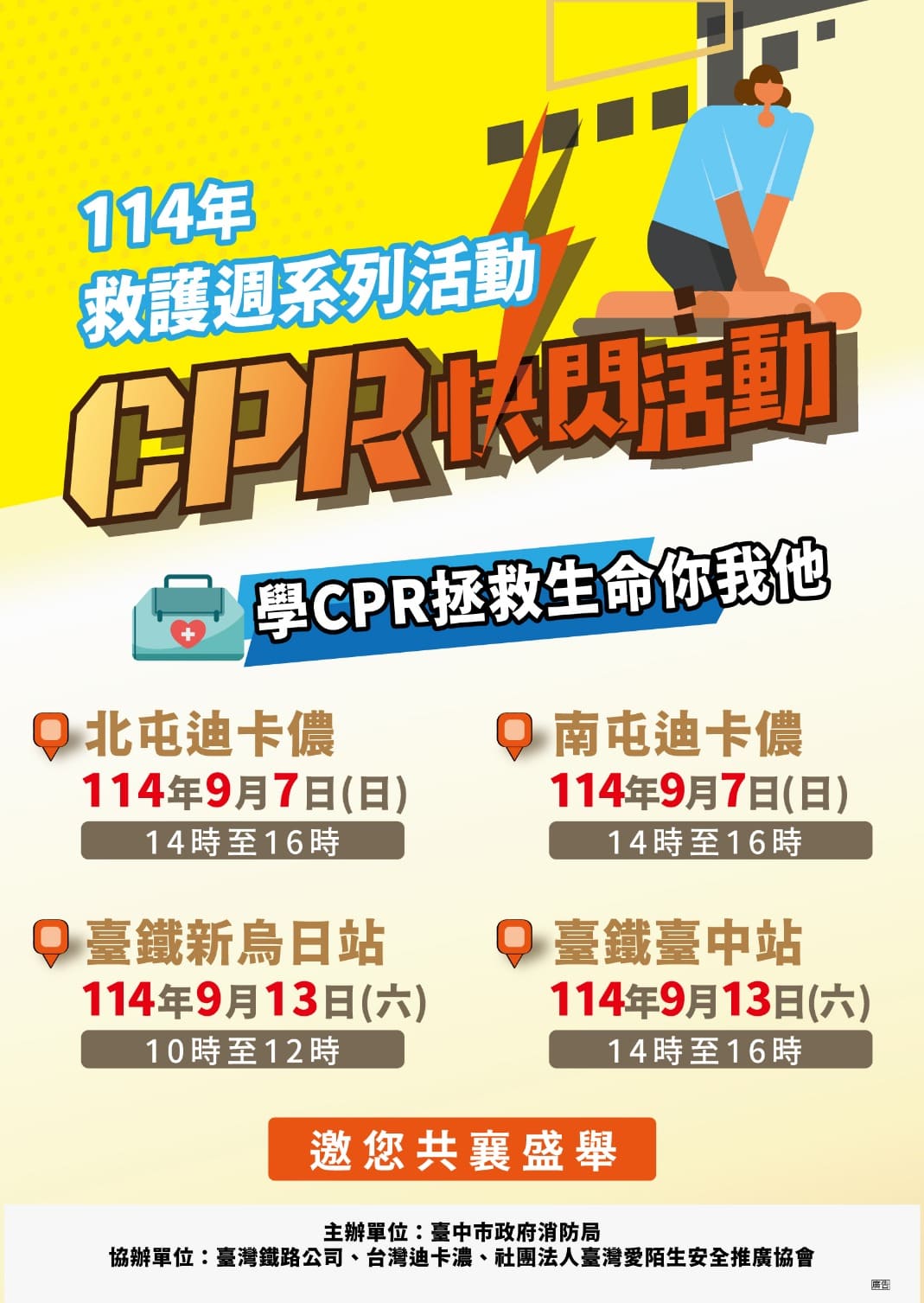 此外,為進一步推廣正確的心肺復甦術(CPR)與急救觀念,消防局將於救護週期間舉辦四場「快閃CPR教學活動」,由專業警義消救護人員與台灣愛陌生安全推廣協會志工現場指導,歡迎市民踴躍參加,各場次舉辦地點及時間資訊如下:9月7日14時至16時在北屯迪卡儂、9月7日14時至16時在南屯迪卡儂、9月13日10時至12時在台鐵新烏日站、9月13日14時至16時在台鐵台中站。