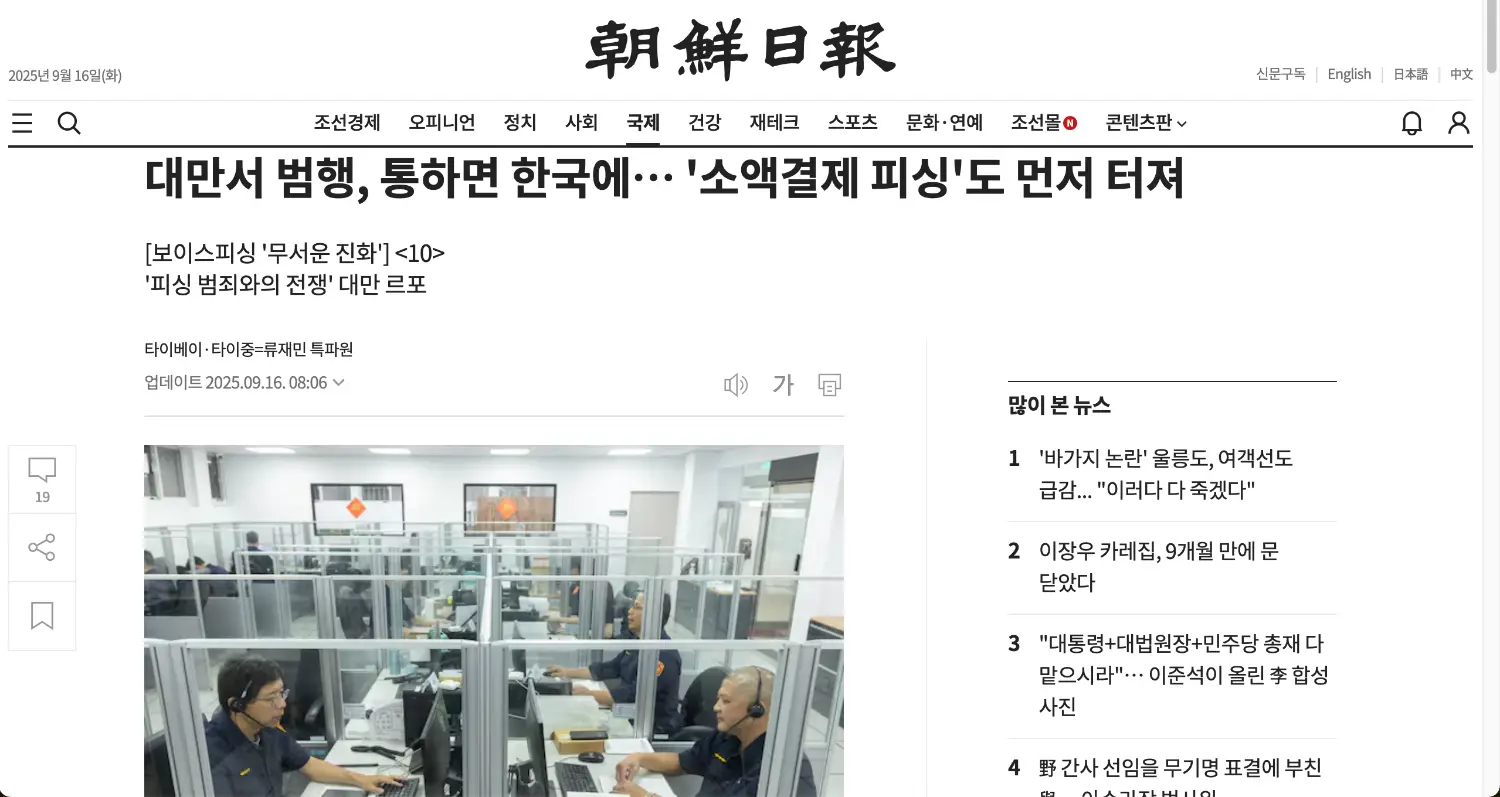 韓媒指出,台灣詐騙手法蔓延南韓,且台灣已成為國際詐騙組織的「實驗場」,作為測試新型詐騙的試驗對象。