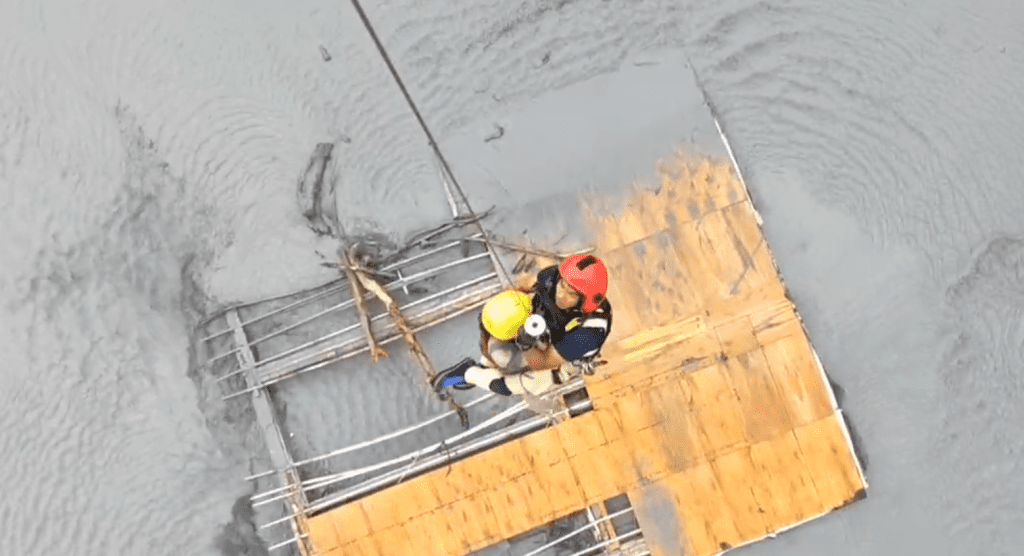 花蓮馬太鞍溪堰塞湖溢流造成嚴重水災多人受困,花蓮空勤隊出動直升機吊掛救出7人。翻攝畫面