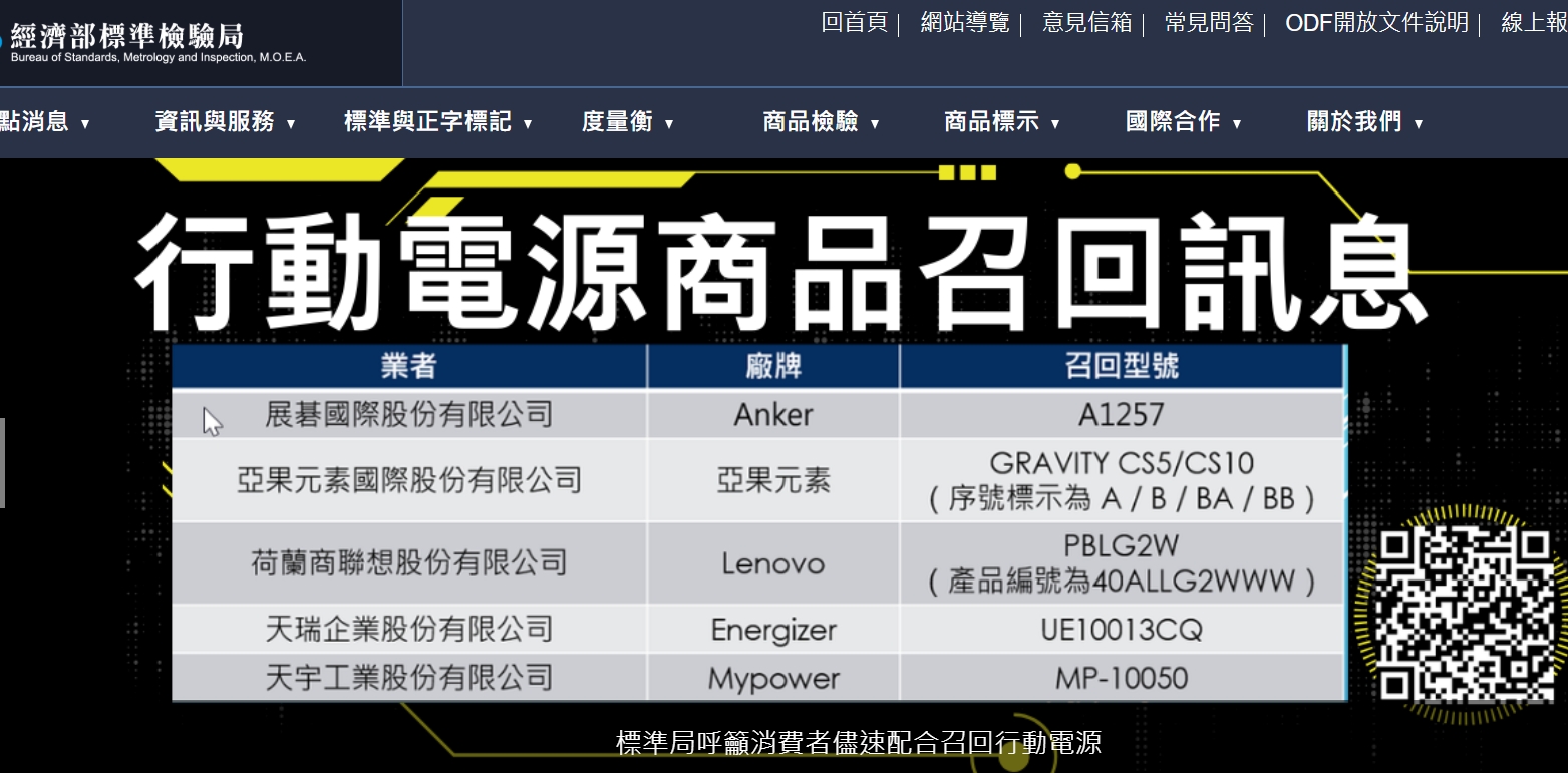 行動電源頻傳自燃!5品牌急召回近9萬顆 消費者自保關鍵一次看.(圖/翻攝 經濟部標檢局 網站)