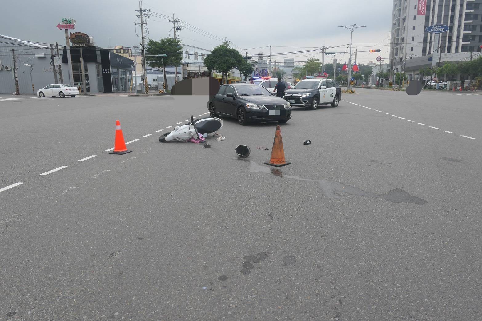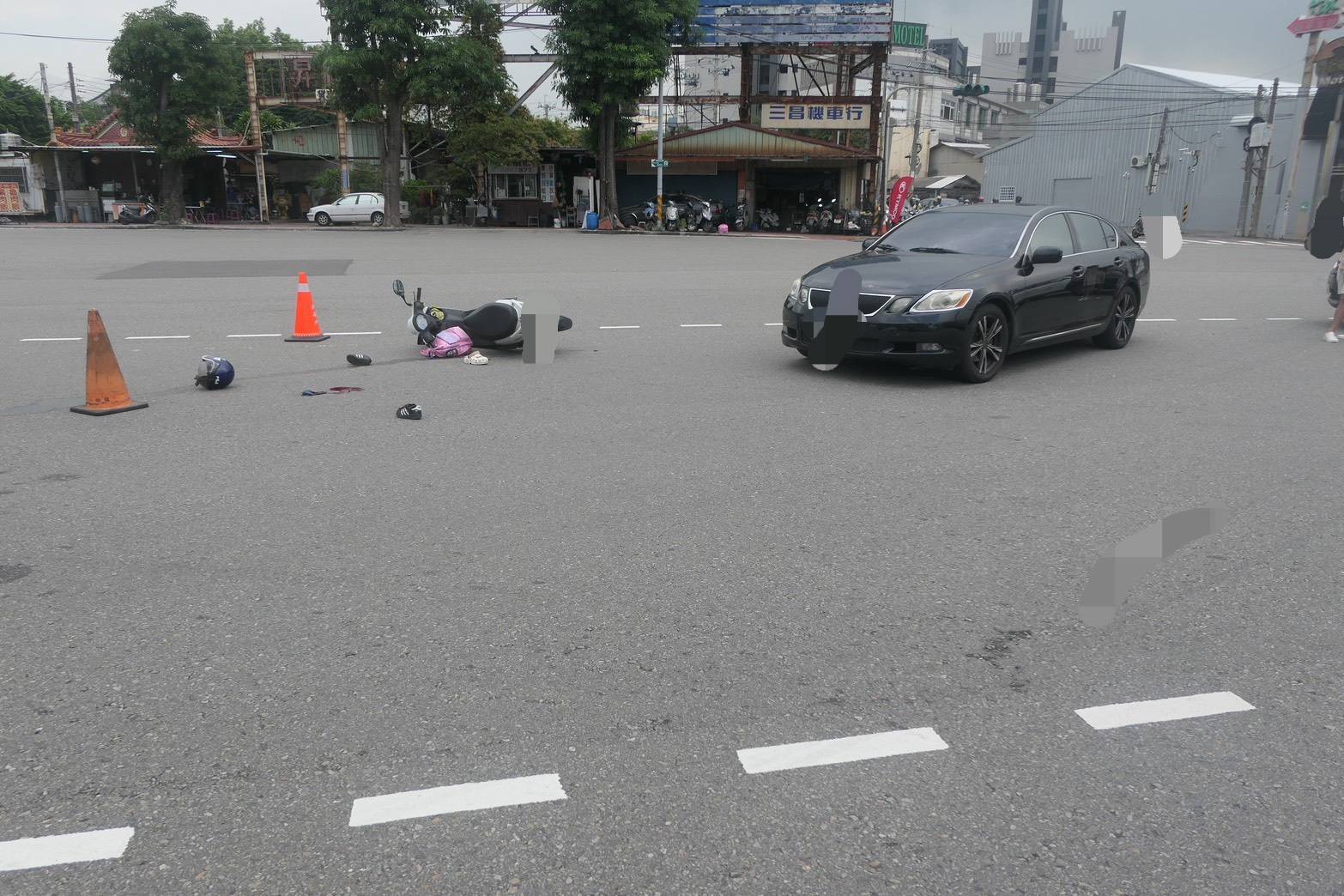 台中沙鹿自小客車與機車相撞,騎士與乘客倒地受傷。翻攝畫面