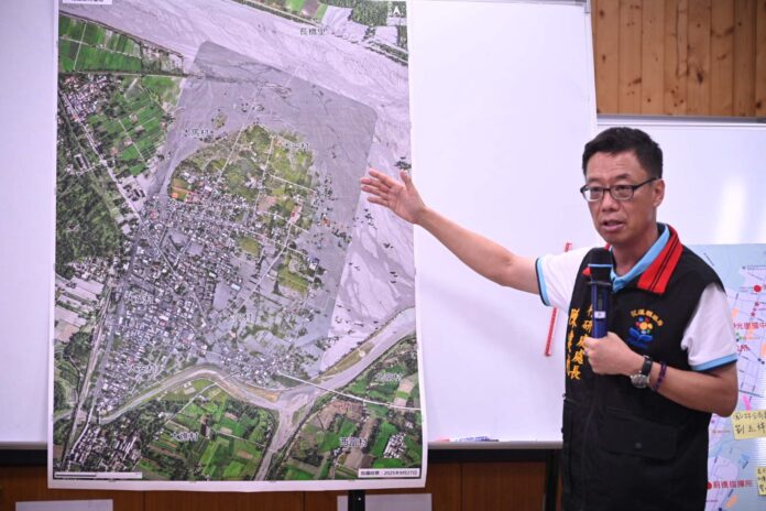 花蓮縣政府行研處長陳建村以空拍圖說明災害情形。(圖∕花蓮縣政府提供)
