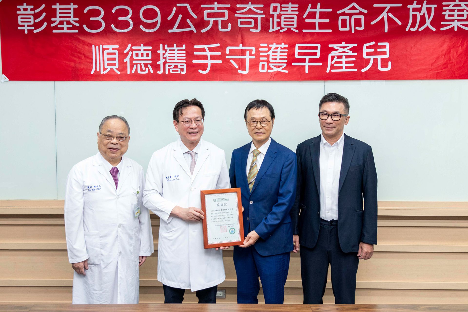 邁入第130年的彰基醫院,在少子化衝擊下,即使賠錢,仍堅持發展兒科及婦產科,承擔中部地區新生兒重症與高危險妊娠孕婦的照護責任。感念彰基的義行,順德工業1日由董事長陳朝興、總經理陳維德與德輝科技副總陳維仁到彰基捐贈一台新生兒輸送型保溫箱及一台新生兒傳送型加護型呼吸器,以及相關醫材,總計約140萬元給彰化基督教兒童醫院,希望以實際行動和彰基一起守護最脆弱的新生命。