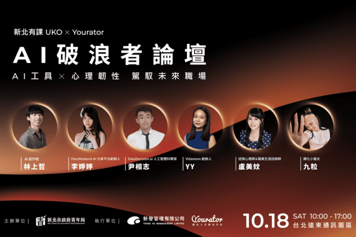 面對AI浪潮對全球職涯帶來的巨大變革,新北市政府青年局的職涯服務品牌「新北有課UKO」積極回應青年需求,將於10月18日(六)在台北遠東通訊園區B1舉辦「AI破浪者論壇︱駕馭未來職場新賽局」。本次論壇將以「技術應用×心理韌性」雙主軸,邀請來自產業實務、數位創作與心理專業領域的知名講者,分享當前進入職場的AI必備工具及AI世代下的心理韌性,協助青年全面提升職涯能力。