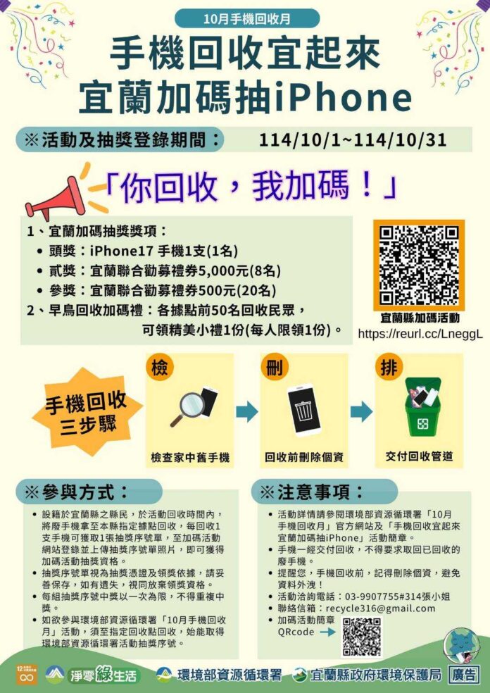 宜蘭縣環保局攜手各鄉(鎮、市)公所,共同辦理「手機回收宜起來 宜蘭加碼抽iPhone」活動。即日起至114年10月31日止,民眾只要將家中閒置不用的廢手機送至指定回收據點,不僅能參加環境部資源循環署的抽獎,更可額外登錄參加宜蘭縣專屬加碼抽獎,有機會將全新 iPhone 17 帶回家。