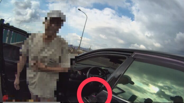 警方叫醒開車途中在駕駛座上睡著的賴姓男子,他一離開車子員警就看到放駕駛座上的喪屍菸彈(紅圈處)。翻攝畫面