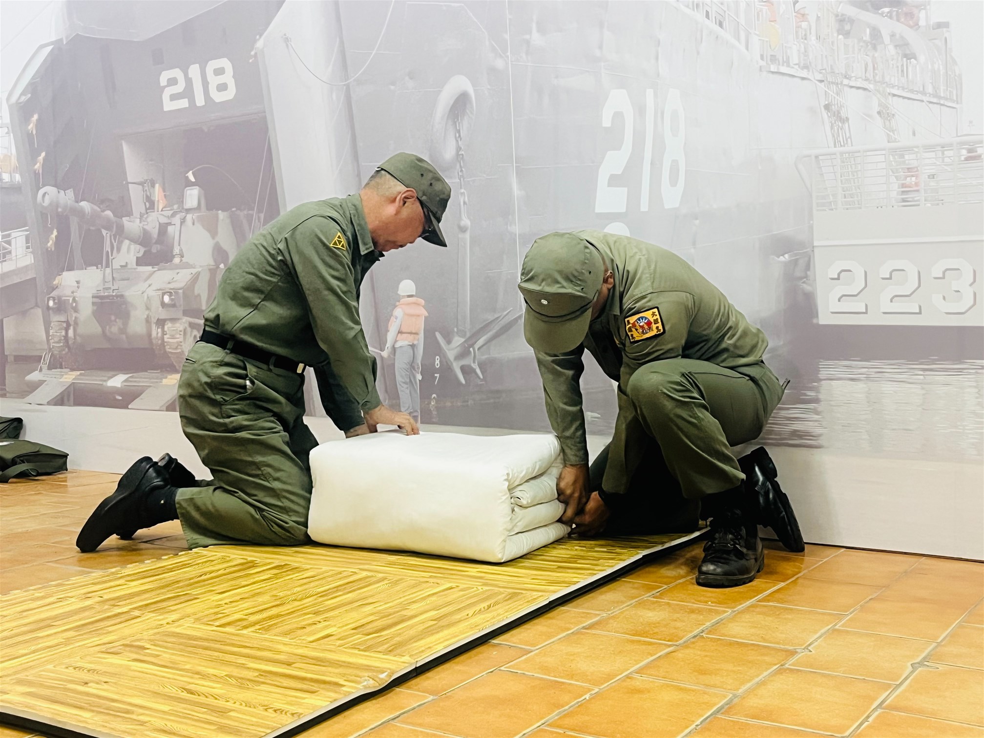 會場活動由老兵們協助進行,由大膽老兵志工洪世家主持,模擬軍方高賓接待模式,簡報兵由余世仁擔任導覽工作、邱棚鴻現場故事分享、錢尊賢及王政義尬折棉被體驗,重現昔日軍旅日常,場面溫馨隆重,與會貴賓紛紛感受跨世代的情感共鳴。
