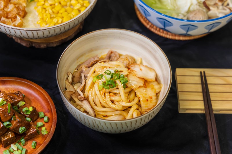 酸香開胃的泡菜遇上厚實彈牙的烏龍麵,瞬間激發出爽快的層次感。麵條緊緊吸附特調拌醬,每一口都帶著酸辣衝擊,隨後釋放豬肉與香菇的鮮香厚度。最後點綴芝麻與蔥花,清新收尾,留下久久不散的餘韻,最適合想要快速提振精神的時刻。
