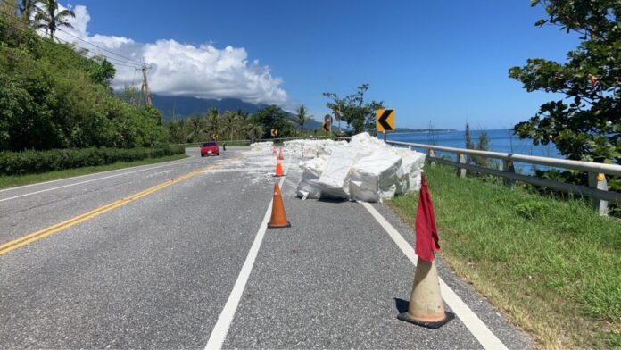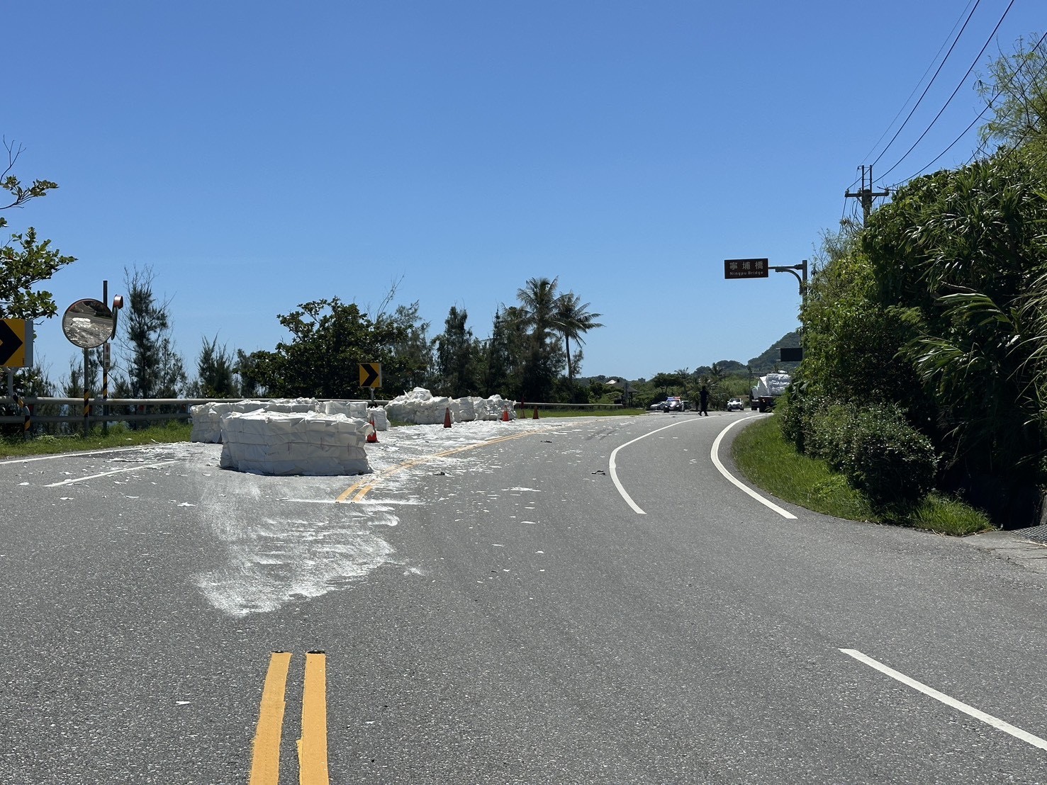 台11線長濱鄉路段發生大貨車載運紙漿掉落路面事故。翻攝畫面