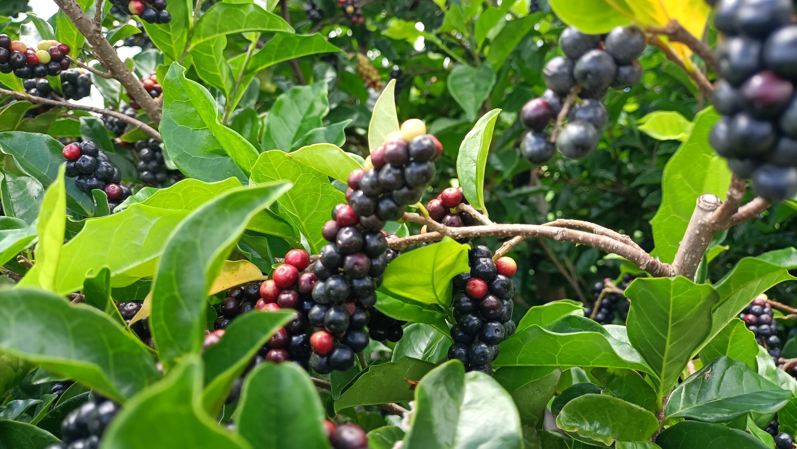 這一串串看似小葡萄的果實叫做枯里珍,是臺灣本土的原生植物,夾雜著綠、黃、紅、紫色的果實,酸甜滋味讓人難忘。