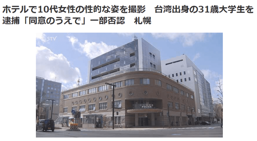 日本札幌警方,於10月3日逮捕了一名來自台灣的31歲男大學生,該男子涉嫌拍攝猥褻影片。