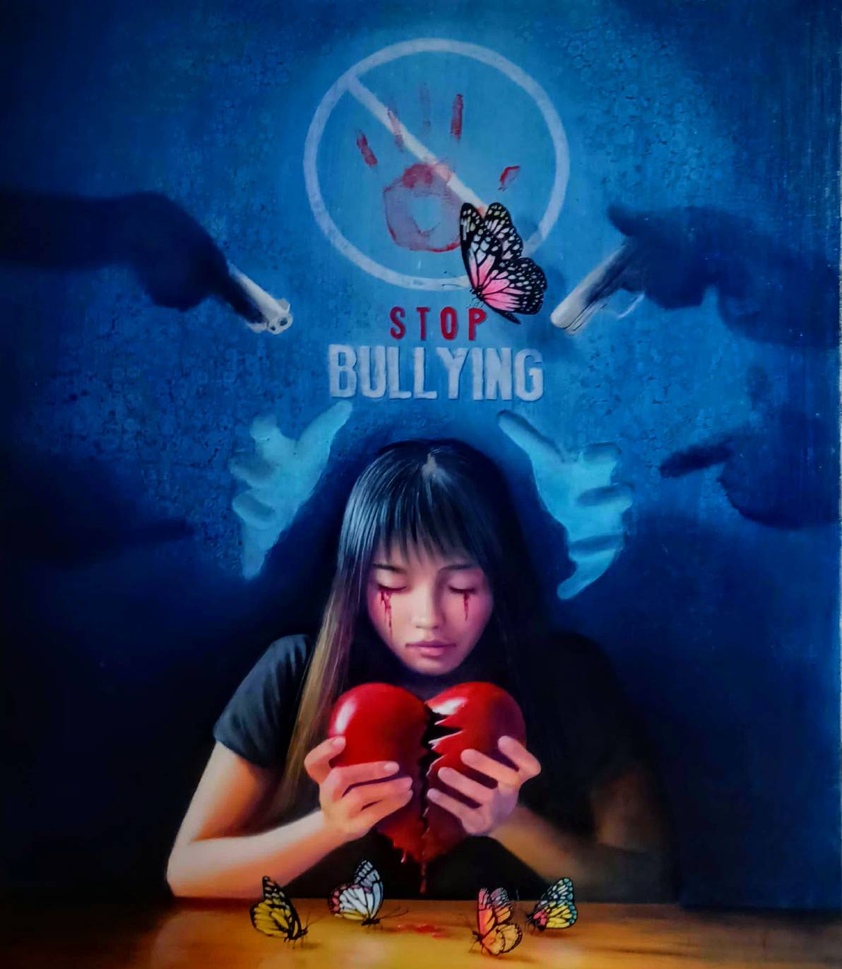 - 中央「停止霸凌」字樣 + 紅色手印 → 堅定呼籲拒絕暴力。