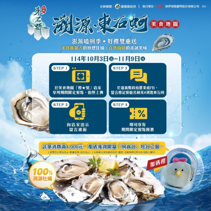 蚵仔是大眾秋節烤肉喜愛的食材,除了在家烤肉,嘉義縣政府也歡迎全台民眾趁10月的中秋、雙十及光復節等連假,來嘉義吃蚵及旅遊,自114年10月3日(五)起至11月9日(日),推出「澎派嗑蚵季 好禮雙重送」活動,只要循著溯源東石蚵美食地圖踩點,就可以享特定餐點優惠及限量蚵寶包好禮。