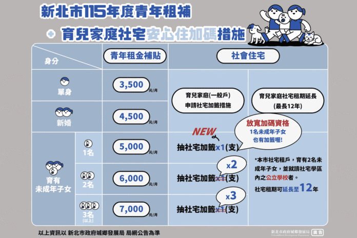 為鼓勵青年成家、減輕育兒家庭居住負擔,新北市政府透過社會住宅及租金補貼協助打造穩定居住環境,即日起同步推出「育有一名以上子女家庭一般戶加籤措施」、放寬「育兒家庭一般戶租期延長措施」,並延續辦理「115年度青年租金補貼」,期藉由多元並行居住政策,打造新北市為青年安居好生養之友善城市。