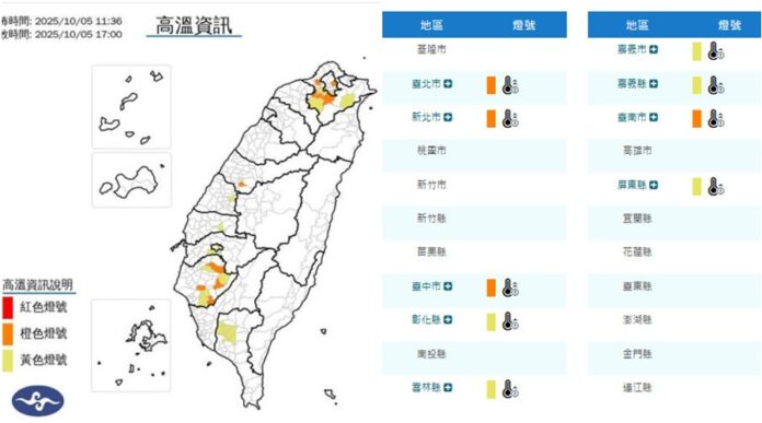 中秋連續假期,今天10月5日各地天氣晴朗炎熱,中午前後臺北市、新北市、臺中市、臺南市有連續出現36度以上高溫的機率,彰化縣、雲林縣、嘉義市、嘉義縣、屏東縣亦有36度以上的高溫,請避免非必要的戶外活動、勞動及運動,注意防曬、多補充水份、慎防熱傷害。今、明兩天午後中南部地區及其他山區有局部短暫雷陣雨。