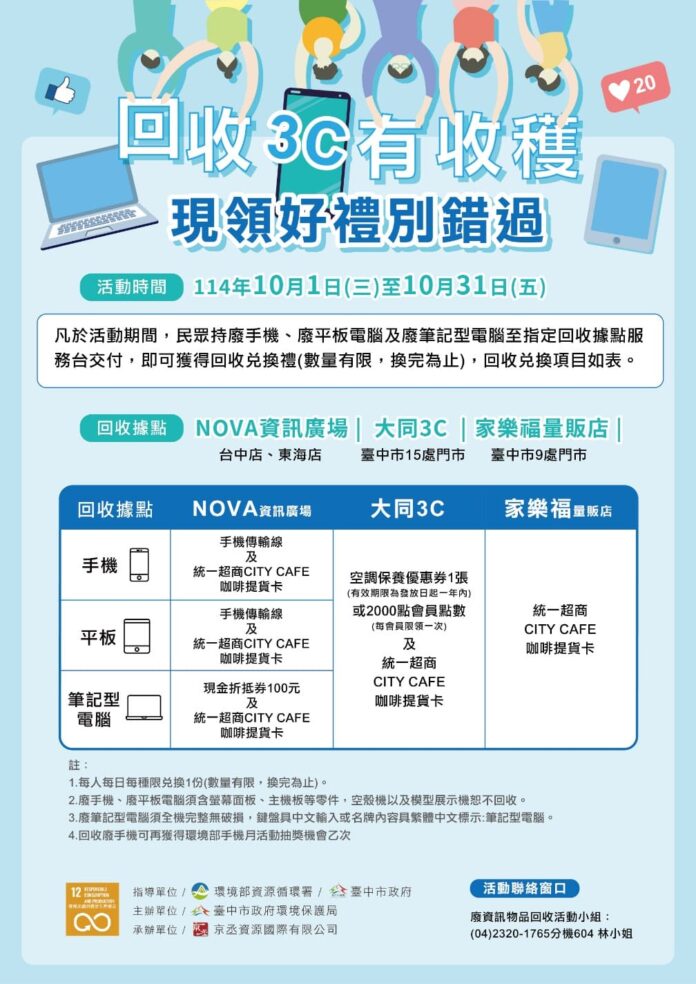 為鼓勵市民將家中廢棄的資訊產品妥善回收,台中市政府環保局配合環境部「10月手機回收月」,即日起至10月31日止,與轄內3C賣場及量販店辦理「回收3C有收穫 現領好禮別錯過」廢資訊物品回收活動。活動期間,至台中市轄內NOVA資訊廣場(台中店及英才店2處門市)、大同3C(15處門市)及家樂福量販店(9處門市)回收廢手機、廢平板電腦或廢筆記型電腦,即可享有限定好禮,數量有限,換完為止!