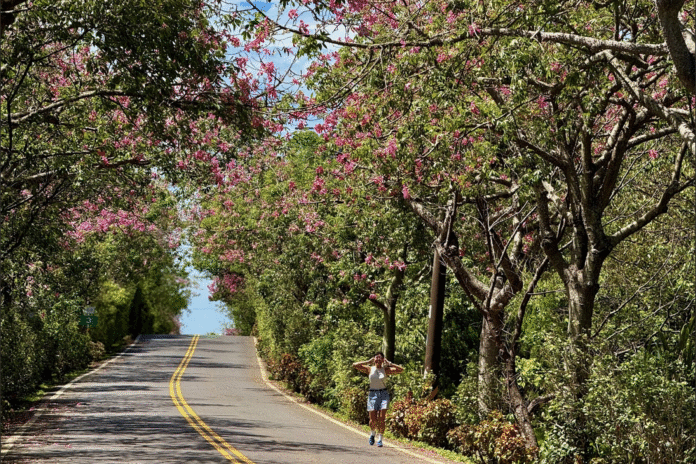 新北景觀處表示,淡水奎柔山路(北8鄉道)是市府近年推動綠美化相當成功的案例之一,這條景觀廊道在淡水區忠山里在地居民志工與里長細心的維護下,已成為熱門的美人樹景點。從北8鄉道宏龍宮往北新莊方向,沿途2公里約種植了300多株美人樹,每到花期便可欣賞到一整排粉紅大道,朵朵桃粉花朵隨著秋風搖曳落下,就像漫步在浪漫花毯上,美不勝收!推薦民眾可以趁著秋高氣爽的好天氣到淡水奎柔山路散步賞花,也可以順遊新北最甜心水池─三芝田心子,玩拍夢幻水田倒影,還可以欣賞到金黃耀眼的金針花,非常療癒。