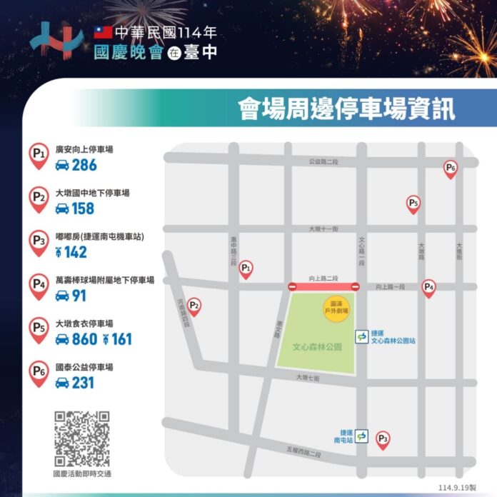 台中市政府交通局長葉昭甫表示,睽違8年,國慶晚會重返台中舉辦,地點在南屯區文心森林公園。因應會場周邊停車空間,民眾可將車輛停放於廣安向上停車場或大墩國中地下停車場,再步行前往會場。向上路(文心路至惠文路段)活動期間將封閉管制,請民眾依指引提前改道;惠文停車場與文心森林公園附屬停車場將作為活動專用不對外開放,建議搭乘大眾運輸,或將車輛停放於捷運綠線沿線停車場,再轉乘捷運前往會場,是最方便的選擇。