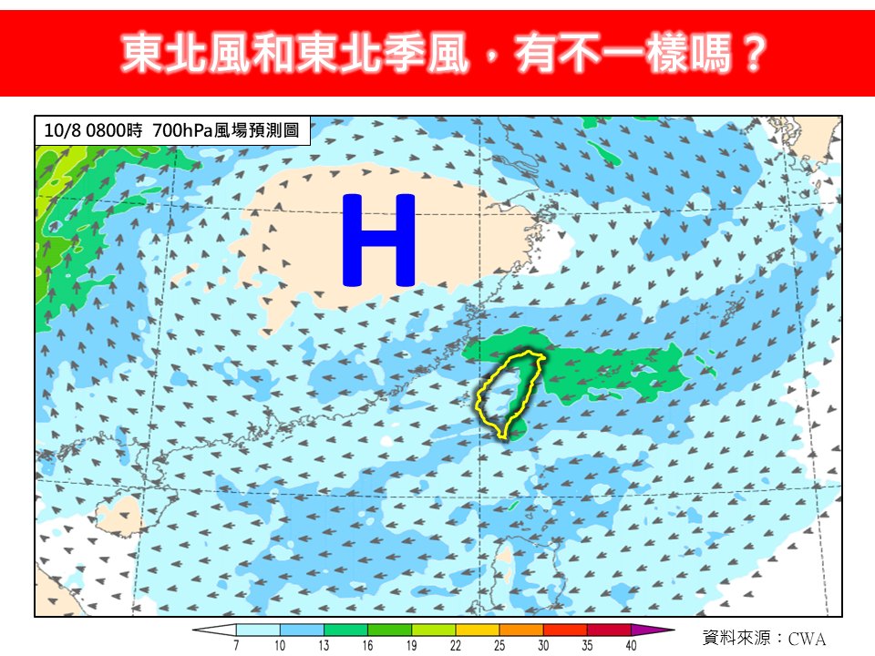 林老師指出,當臺灣附近風向來自東北、但冷空氣不強時,稱為東北風;若冷空氣增強、導致臺北站氣溫降至20度以下,才算是真正的東北季風。換句話說,東北風只是風向,而東北季風才是冷空氣發威的天氣系統。