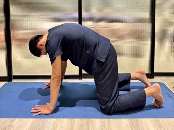 - 貓牛式:四足跪姿,交替拱背、凹背,可同時活動頸、胸、腰椎。