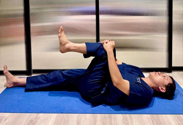 - 單膝抱胸:仰躺,單膝抱向胸口,另一腳伸直,拉伸腰部; 或改成雙膝抱胸亦可。