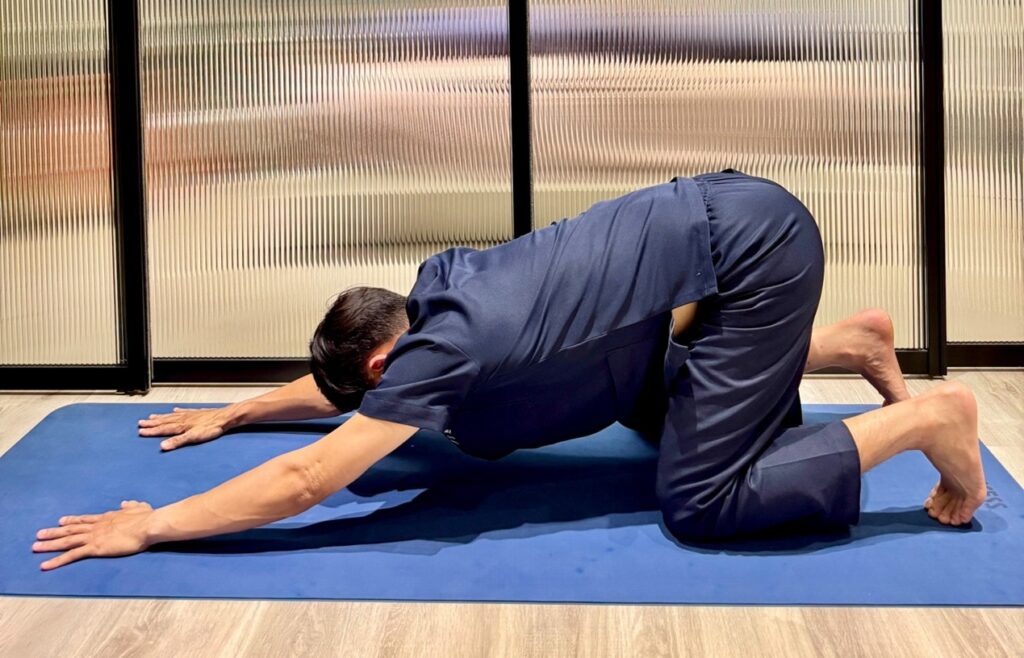 - 嬰兒式:呈日式跪坐,臀部坐向腳跟,手部向前延伸,拉開腰椎與背部。