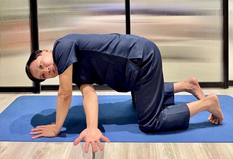- 旋轉胸椎:四足跪姿,一手往對側手及對側膝蓋中間穿越,旋轉胸椎,拉伸上背。