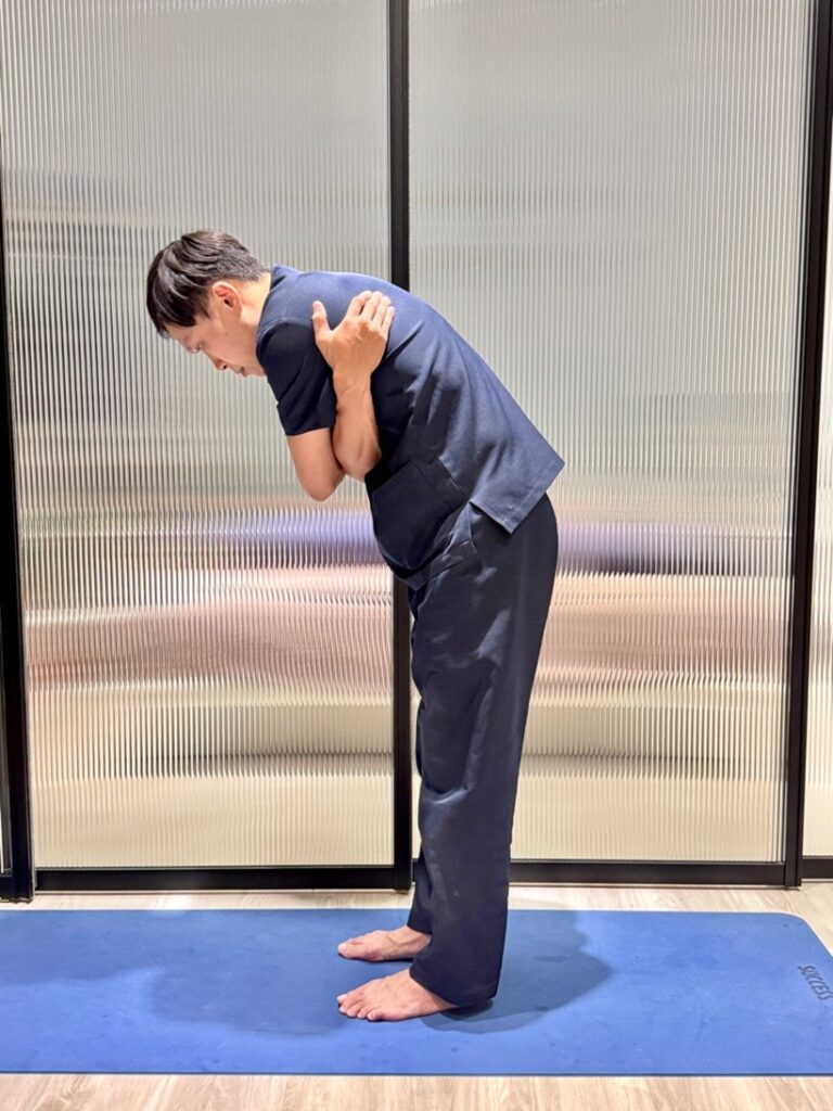 - 雙手環抱:環抱身體後,用雙手相互扣住對側肩胛骨外側緣,身體向前傾斜,可伸展背部菱形肌。