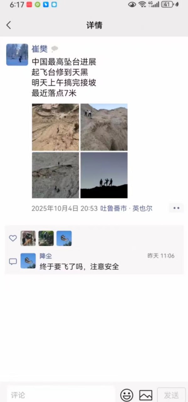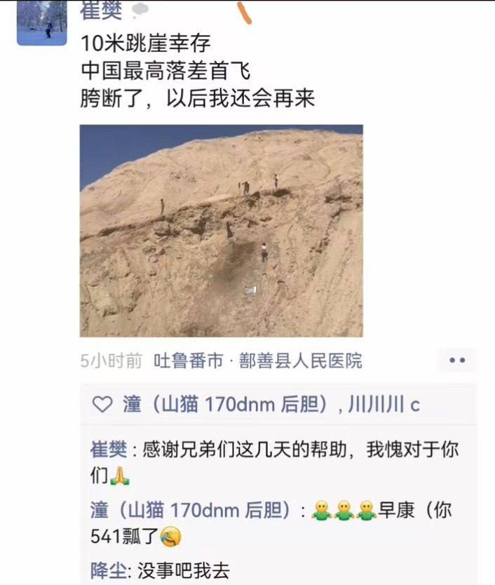2025年10月上旬,新疆吐魯番市,一名山地速降極限運動愛好者,在進行約10公尺高的跳崖動作時失誤受傷,隨後被送往當地醫院。