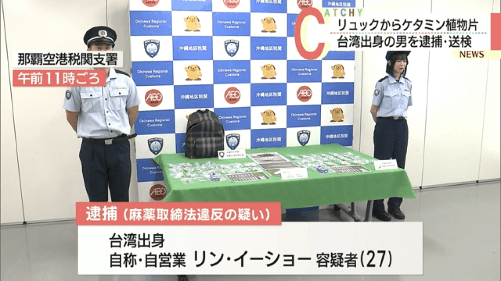 根據琉球朝日放送報導,台灣27歲男子被控於2025年9月22日,將含有「K他命」的植物碎片17.09公克 走私進入沖繩。