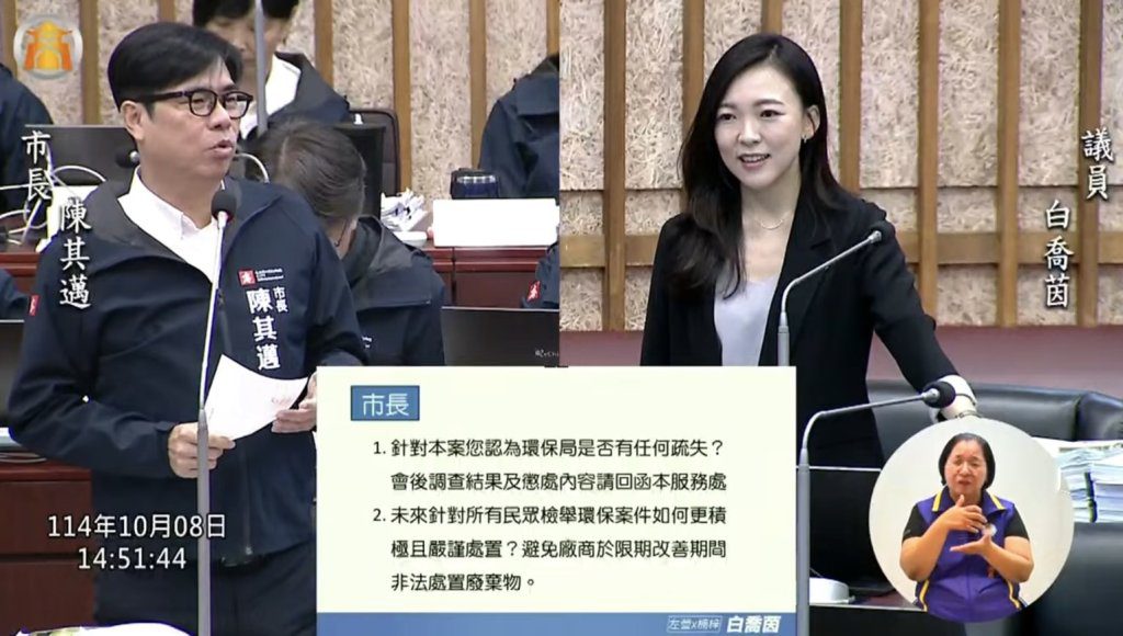 白喬茵指出,某廢棄物清除業者長期違法經營,市府卻僅以最低罰則處理,直到新北地檢署介入調查後,案件才於今年6月曝光。不法集團非法輸出廢棄物,獲利高達4,954萬元,但涉案工廠至今仍持續運作,讓市長陳其邁「嚴查嚴辦、絕不寬貸」的宣示形同空談。