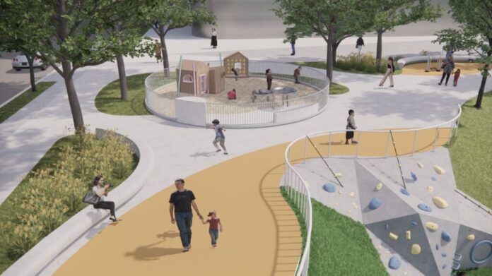 楊欽富表示,O9滯洪公園位於苓雅運動園區與周邊場域之間的過渡地帶,規劃理念以「滯洪、運動、遊戲」為核心,整體面積約0.57公頃,導入LID(低衝擊開發)理念,提升基地保水與入滲能力,滯洪量可達5633立方公尺,有效強化都市防災韌性。