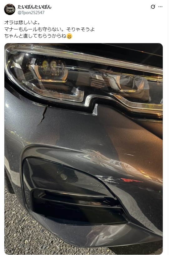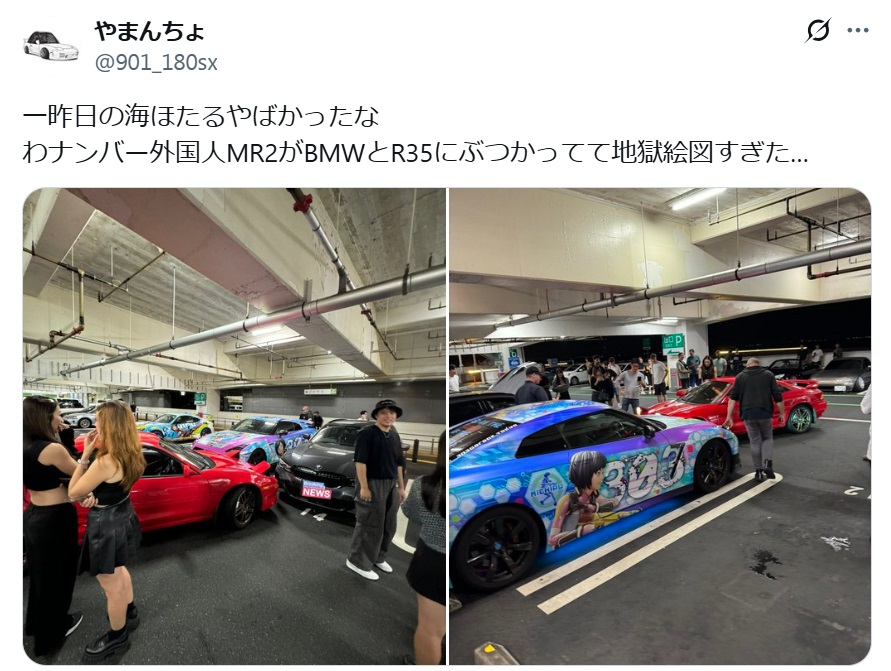 事發後拍下的照片顯示,MR2 的前保桿嚴重損壞,撞上對面停放的BMW 320d與GT-R R35,現場也有民眾受波及。由於有人員受傷,Giulia 隨即被警方帶回。被撞的BMW車主也在網上發布了照片,他表示這是一起「停車中被撞」的意外,因此過失比例是明確的 10比0,但愛車被如此破壞仍讓人難以接受。