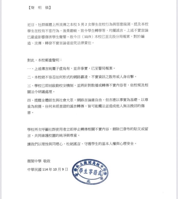近日,社群媒體上所流傳之本校 5 男 2 女學生在校行為與惡意揣測,提及本校學生在校有不當行為,後果嚴峻,致令學生輿論等,均屬謠言。上述不實言論已嚴重影響傷害學生聲譽,故今日(10/9)本校已至北投分局報案,對於編造、流傳、轉發不實言論者追究法律責任。