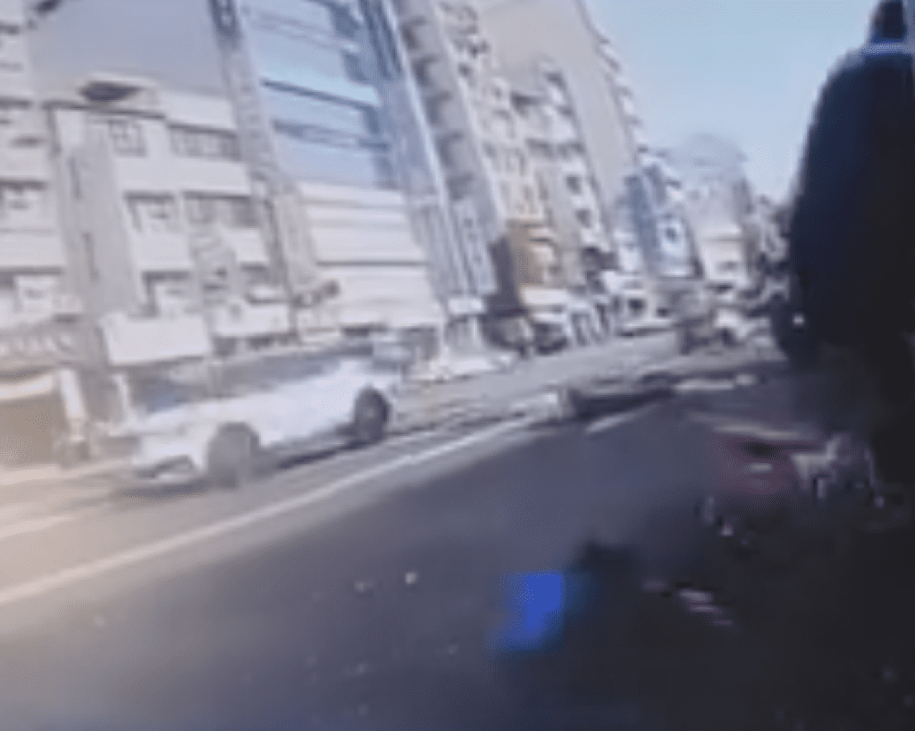 台中機車騎士被撞倒連人帶車滑行差點掃到路人。翻攝畫面