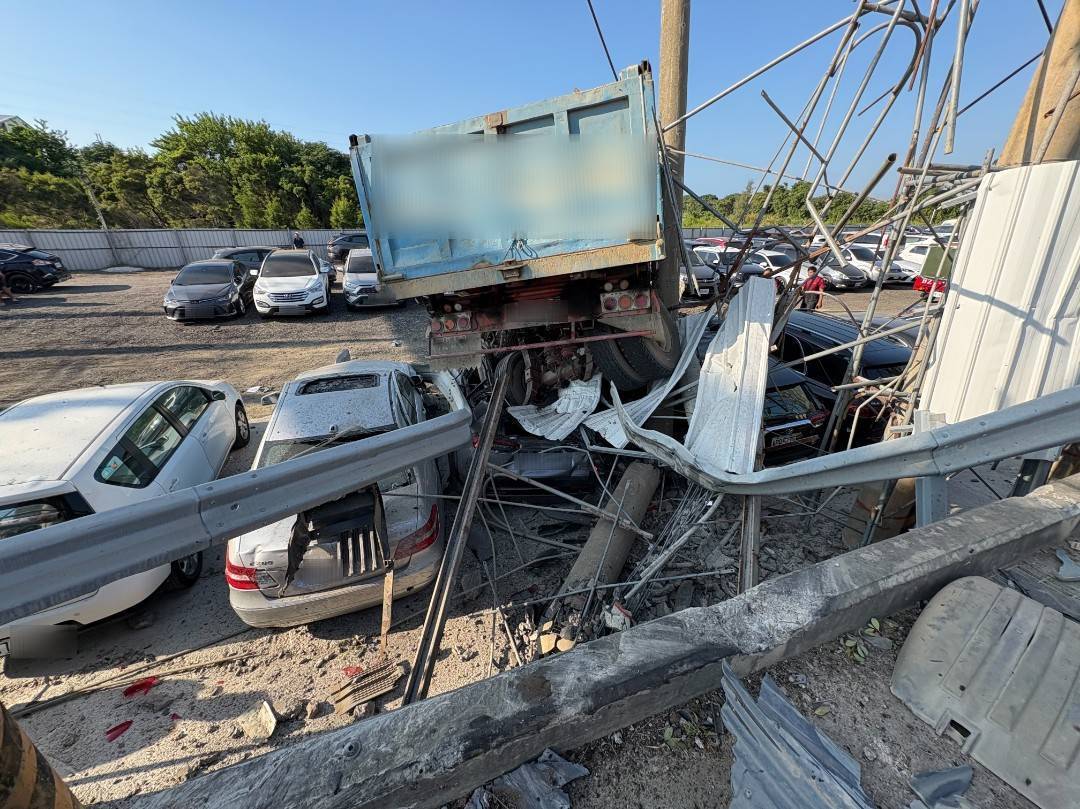 國道2號大貨車撞進匝道口附近停車場,壓毀多輛車造成1人受傷。翻攝畫面
