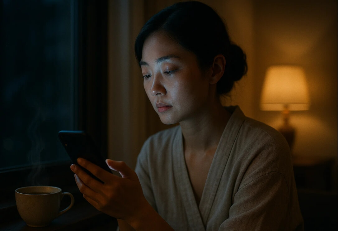 妳是不是也常這樣?追著劇、滑著手機,一抬頭,夜早已深,眼裡卻像燃著微火。那一抹紅,不只是疲勞,而是身體在提醒:該讓自己停下了。