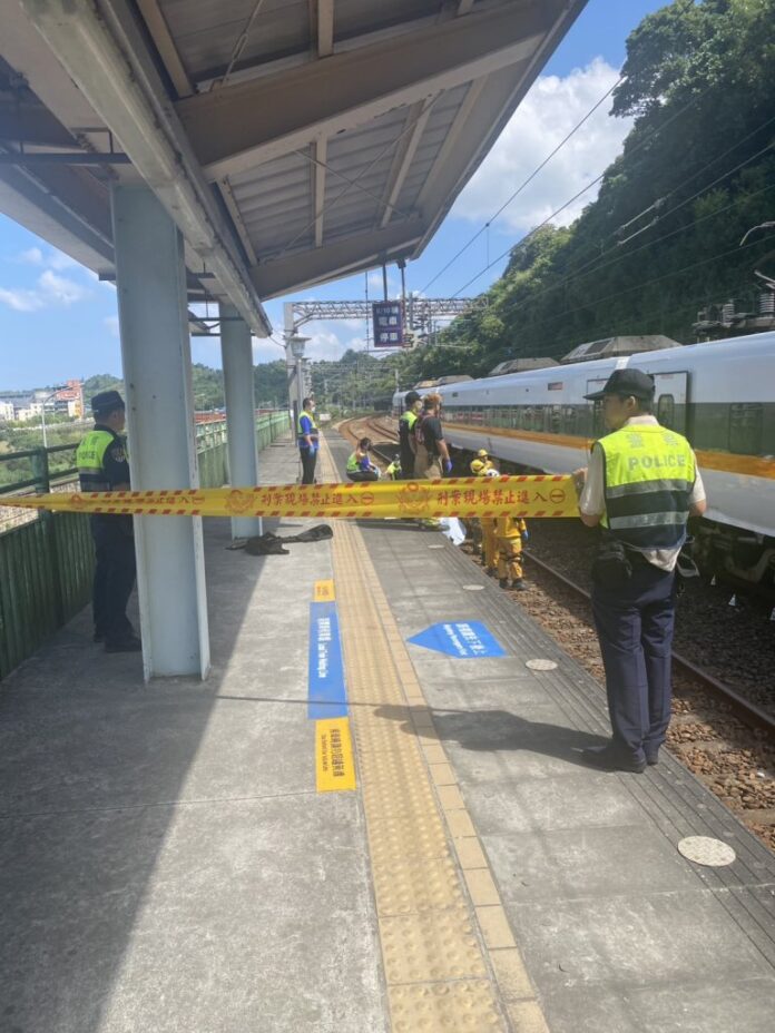 台鐵百福車站發生男子墜落軌道遭列車撞擊事故,警方封鎖現場調查處理。翻攝畫面