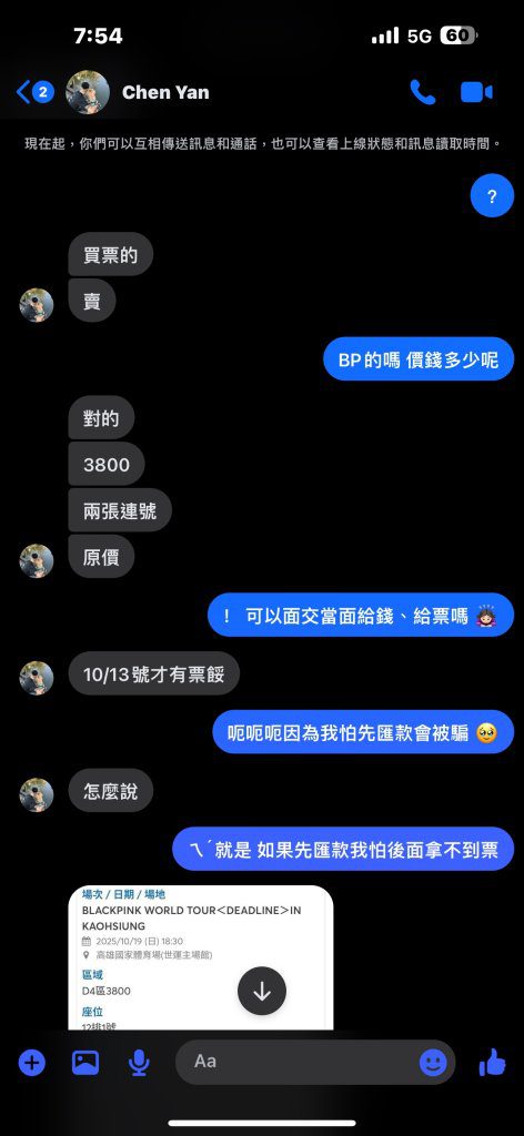 該名粉絲表示,一位自稱有預售連號門票的陌生網友主動聯繫,聲稱持有原價3800元的兩張票,並提供場次、座位資訊博取信任。粉絲擔心受騙要求面交,對方卻以「票要到10月13日才拿得到」為由要求先轉帳,雙方約好在里港公園交票。沒想到被害人依約前往卻等不到人,對方更在事後刪除臉書帳號,粉絲損失7600元才驚覺受騙。