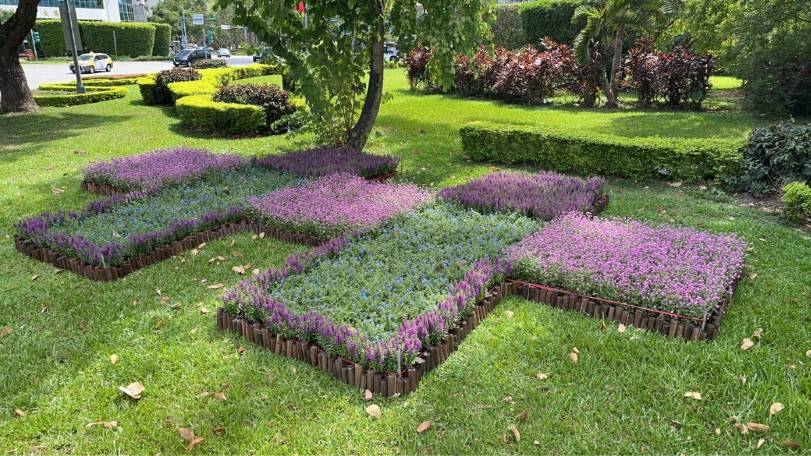 這次仁愛圓環2處繽紛的雙十造景運用1千5百餘盆的草花,有千日紅、藍星花、天使花等種類。這些草花都是出自公園處苗圃同仁自行播種、移盆、培育、施肥、養護等,可說是能人巧手達人的綠手指默默耕耘而來,而造景佈置過程於10月1日由苗圃同仁現地放樣後,在當日趕工1天完成。繽紛草花色彩及歡悅氛圍呈現出對光輝十月的祝福,展期自即日起至10月28日為止。